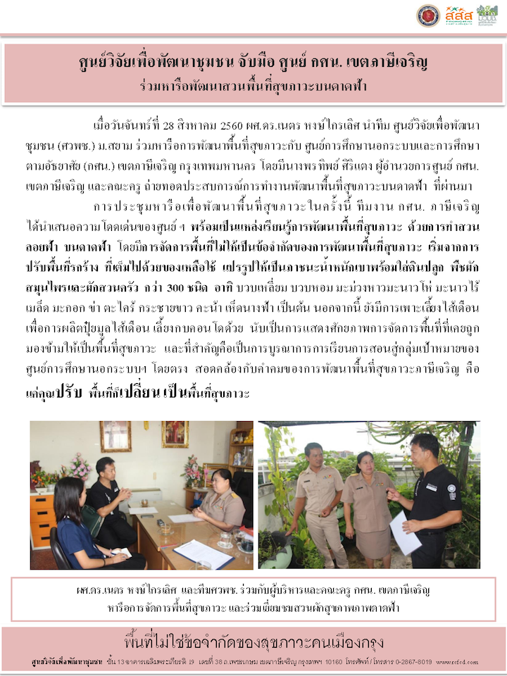 ‹ Return to ศูนย์วิจัยเพื่อพัฒนาชุมชน จับมือ ศูนย์ กศน. เขตภาษีเจริญ ร่วมหารือพัฒนาสวนพื้นที่สุขภาวะบนดาดฟ้า