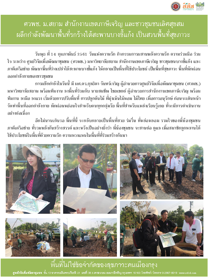 ‹ Return to ศวพช.ม.สยามสานักงานเขตภาษีเจริญและชาวชุมชนเลิศสุขสม ผลึกกำลังพัฒนาพื้นที่รกร้างใต้สะพานบางขี้แก้งเป็นสวนพื้นที่สุขภาวะ