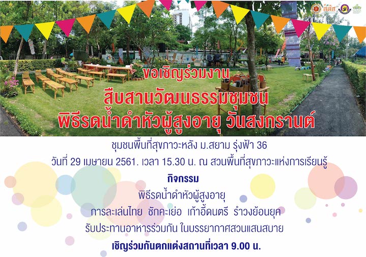 ‹ Return to ขอเชิญร่วมงาน สืบสานวัฒนธรรมชุมชน พิธีรดน้ำดำหัวผู้สูงอายุ วันสงกรานต์ ชุมชนพื้นที่สุขภาวะหลังม.สยาม รุ่งฟ้า 36