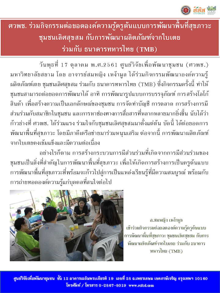‹ Return to ศวพช. ร่วมกิจกรรมต่อยอดองค์ความรู้ครูต้นแบบการพัฒนาพื้นที่สุขภาวะ ชุมชนเลิศสุขสม กับการพัฒนาผลิตภัณฑ์จากใบเตย ร่วมกับ ธนาคารทหารไทย (TMB)