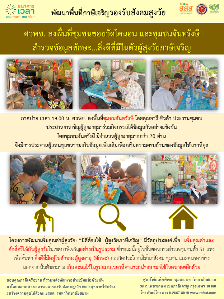 ศวพช. ลงพื้นที่ชุมชนซอยวัดโคนอน และชุมชนจันทรังษี สำรวจข้อมูลทักษะ…สิ่งดีที่มีในตัวผู้สูงวัยภาษีเจริญ